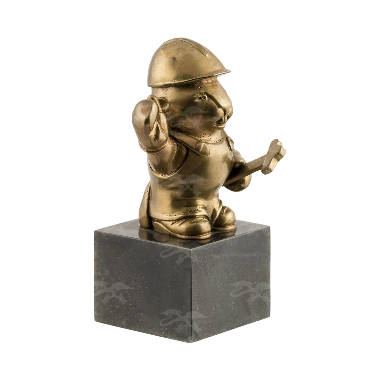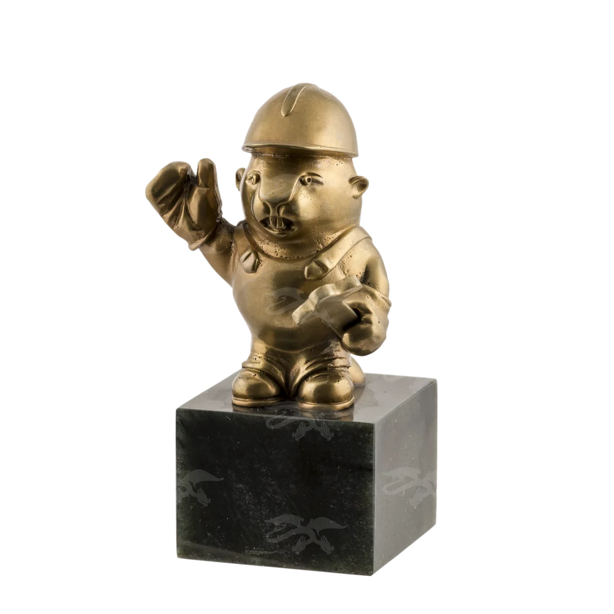 Мастерская «Калежа» изготавливает статуэтки, изображающие животных. Оригинальный сувенир «Бобер строитель малый» создан из латуни благодаря использованию художественного литья. Чтобы получить изображение, наши специалисты применяли гравировку. Подставка выполнена из черного камня. Изготовление уникальных статуэток занимает до трех недель. Кроме того, мастера работают с эскизами, которые выполняют клиенты.