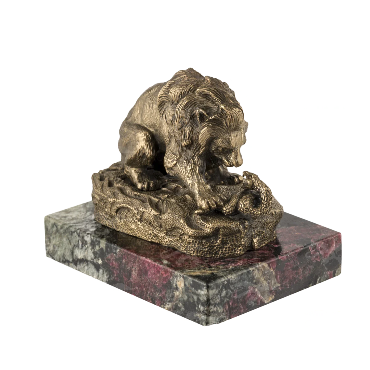 Мастерская «Калежа» изготавливает уникальные статуэтки с изображением животных. Нами выполнен сувенир «Лев с подставкой». В своей работе мы использовали бронзовое литье. Для оформления фигурки мастера также применяли технологию чернения. Оригинальная сувенирная продукция создается в течение трех недель. Возможно использование любых эскизов, подготовленных заказчиком самостоятельно.