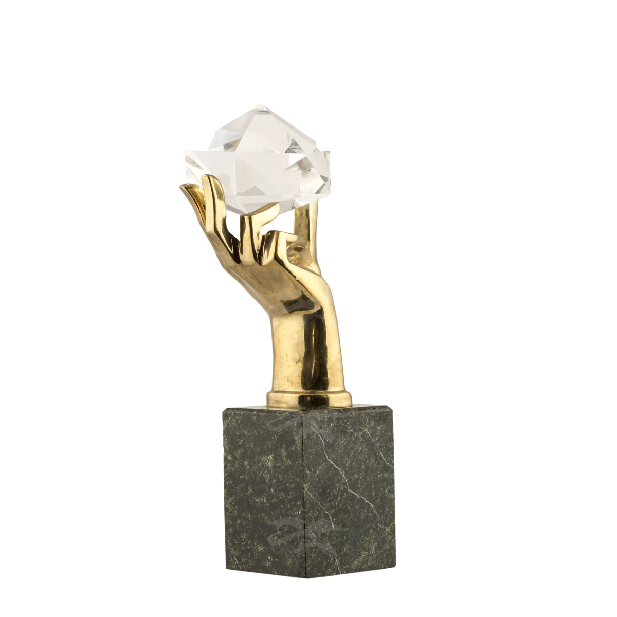 Мастерская «Калежа» изготавливает уникальные статуэтки. Сувенир «Рука с кристаллом» выполнен при помощи художественного литья. Чтобы обработать поверхность, мы применяли полирование и золочение. Основание изготовлено из натурального камня, а имитация драгоценности – из стекла. В оформлении также можно использовать новые элементы или изменить существующие. Подобная работа будет выполнена в течение трех недель.