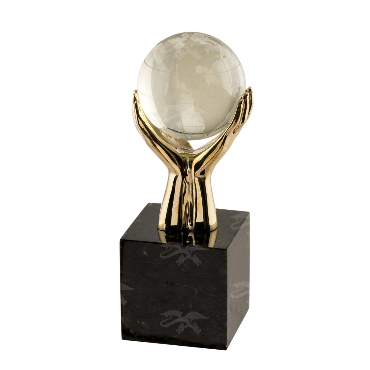 Сувенир «Руки со стеклянным шаром» сочетает сразу три натуральных материала — прозрачное стекло, гладкий натуральный камень и блестящую латунь. Необычное изделие станет оригинальным корпоративным сувениром или наградной статуэткой для победителя конкурса. По запросу внесем в образец любые изменения. Можем затонировать металл другим оттенком, убрать или увеличить постамент, скорректировать форму рук.