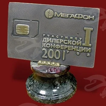Замысловатый сувенир был изготовлен для известного оператора мобильной связи – компании «Мегафон». Дизайн статуэтки представлен в виде карточки с изображением названия организации. С левой стороны посередине размещена символическая сим-карта. А в правом нижнем углу – информация о проходившем мероприятии. Наши квалифицированные мастера могут изготовить подобный сувенир и нанести символику вашей компании методом гравировки на все варианты изделий, которые предлагает наш магазин бизнес-сувениров.
