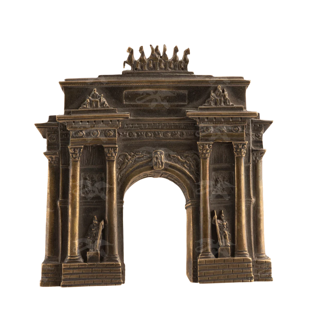Декоративная накладка «Триумфальная арка» — необычный сувенир, который можно использовать как награду для победителя или напоминание о достигнутом. Специалисты мастерской «Калежа» отлили арку из бронзы по индивидуальному заказу. Им удалось передать в металле мельчайшие детали архитектурного сооружения: капители колонн, барельефы над проездом. При создании уникальных сувениров по авторским эскизам мастера учитывают все пожелания клиента к цвету, фактуре, размерам. Вы получите именно то, что заказывали. Обращайтесь!