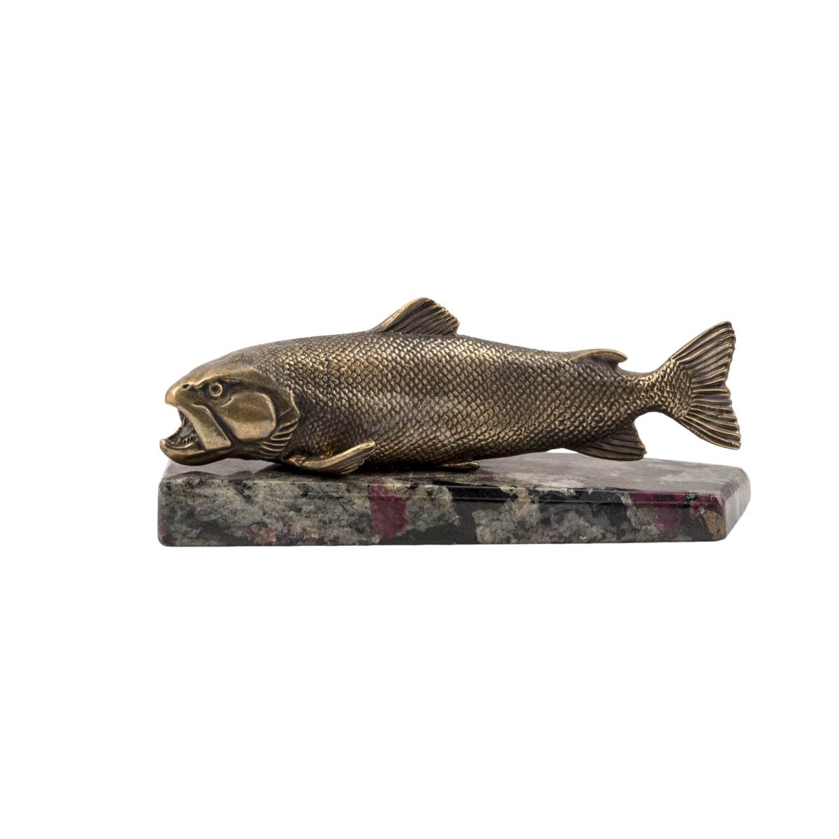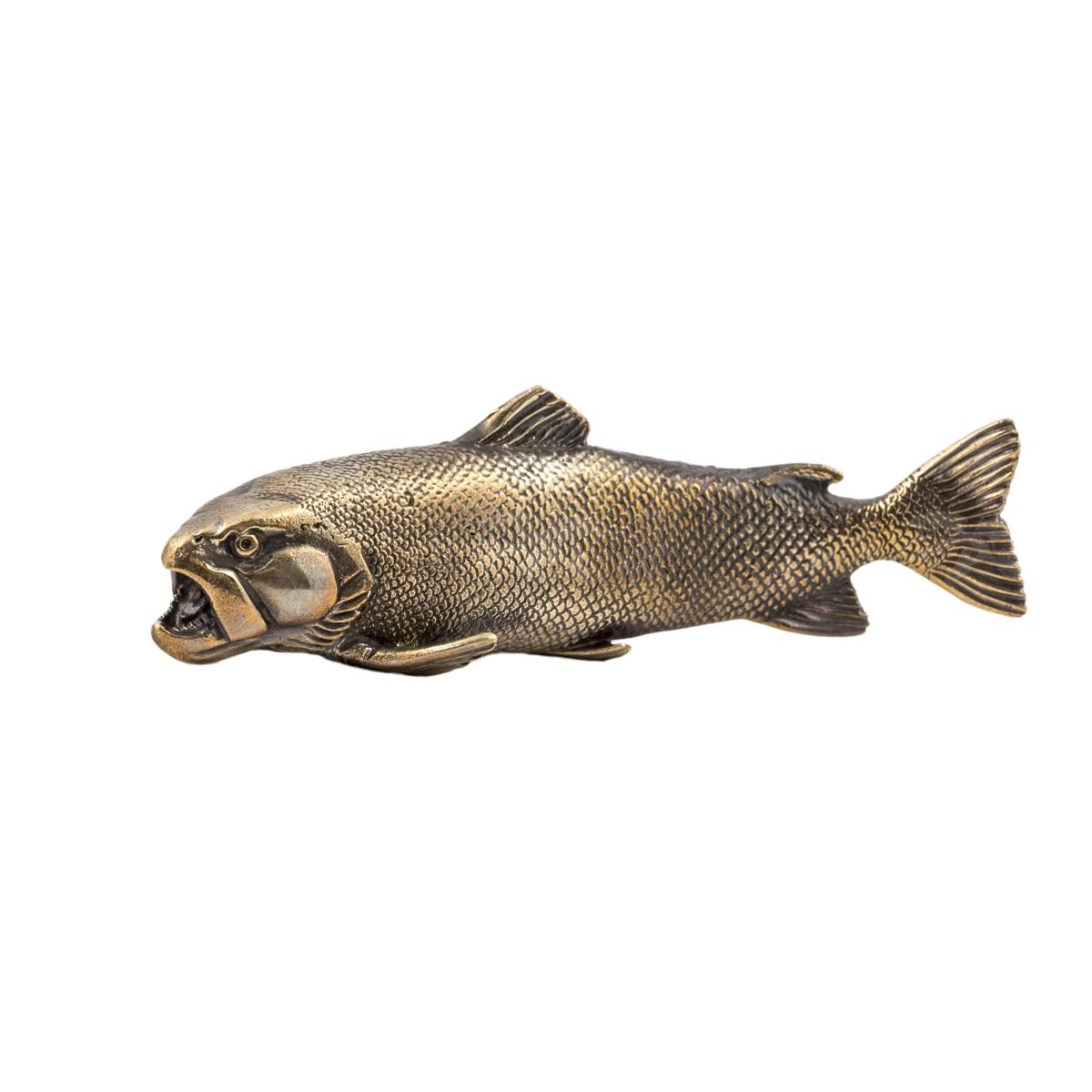 Мастерская «Калежа» изготавливает оригинальные статуэтки рыб, используя в качестве основного материала пластичную латунь. Образец для новых работ – таймень маленький, созданный по технологии бронзового литья. Рельеф фигурки выполнен с помощью химической гравировки и чернения. Рыбка закреплена на каменной подставке. Изготовление сувениров в подобном стиле занимает до трех недель.