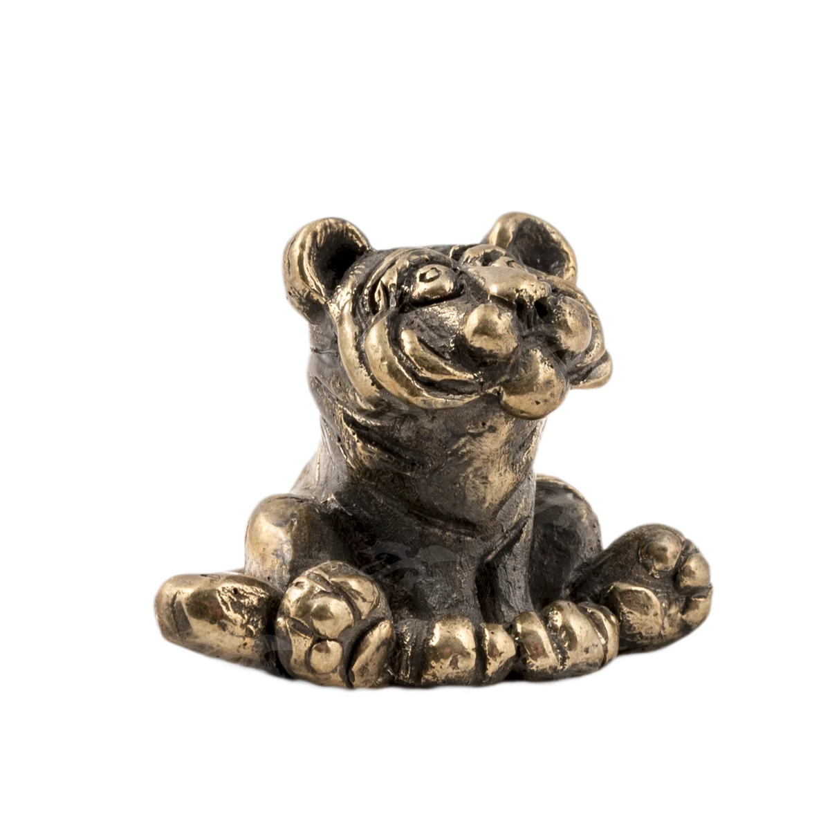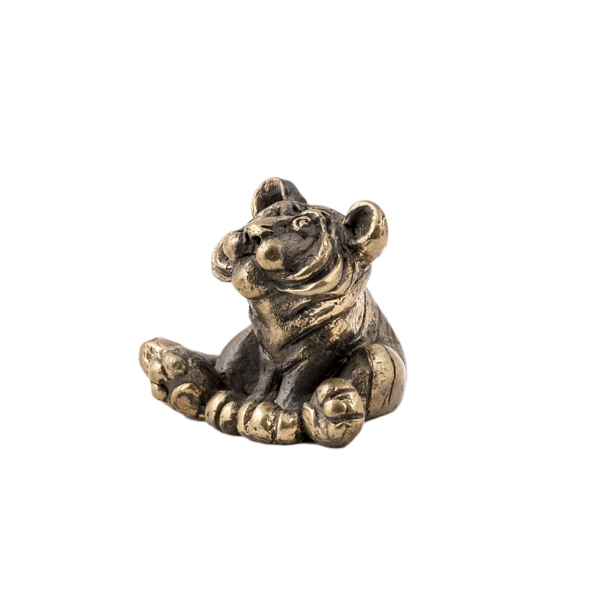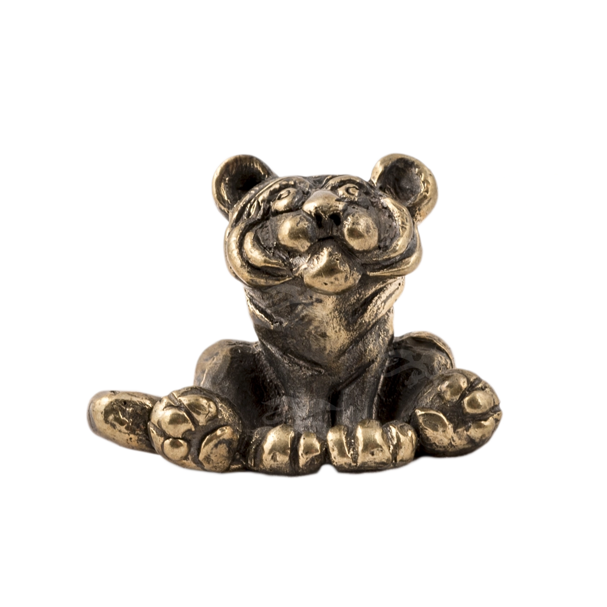 Мастерская «Калежа» создает креативные статуэтки диких животных из латуни. Для изготовления тигренка применялось художественное литье. Рельефное изображение шерсти получено при помощи химической гравировки и чернения. Можно изменить оформление, позу тигра, добавить новые детали. Мастера также работают по готовым эскизам. Срок выполнения заказа – три недели.