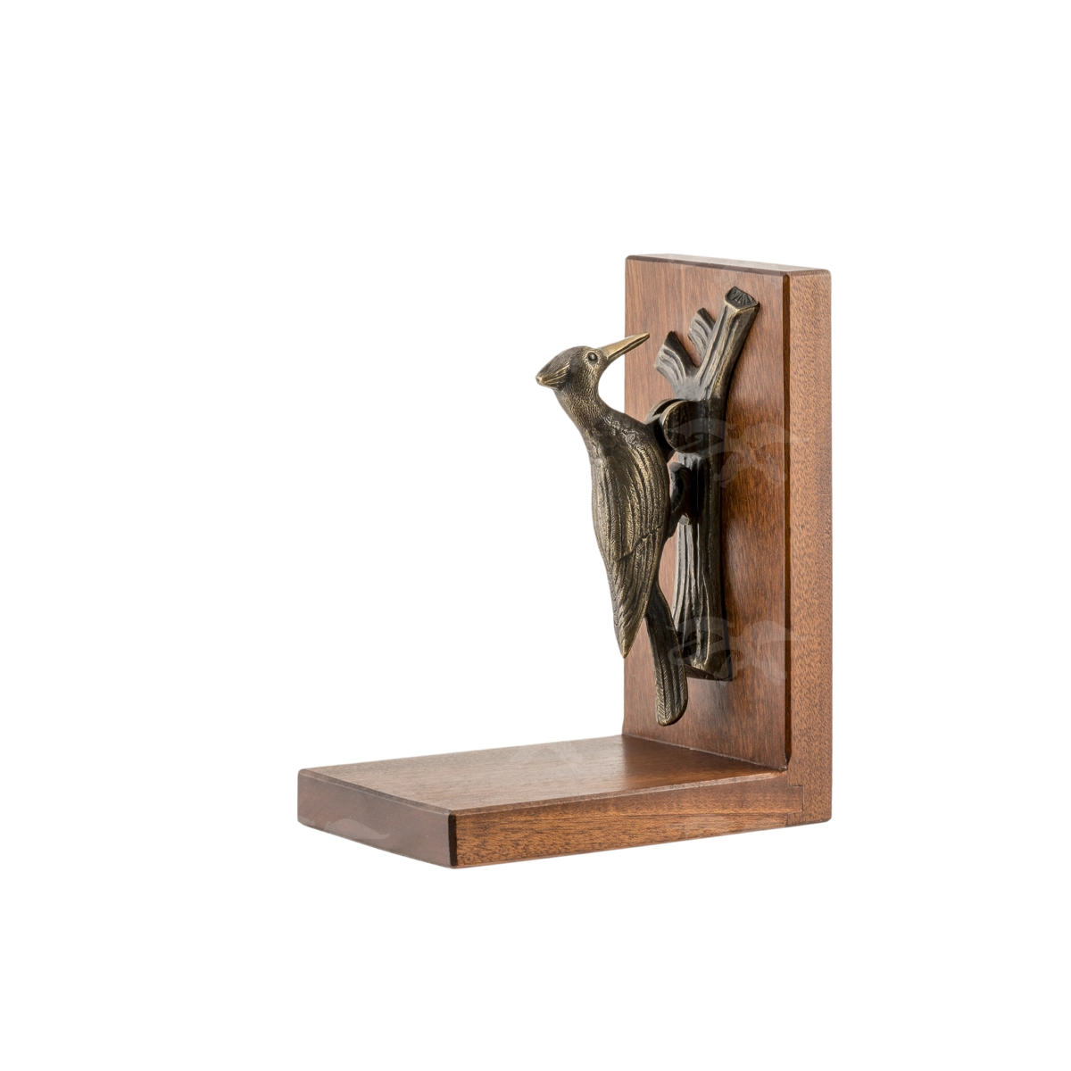 Упор для книг дятел выполнен из латуни – для этого наши мастера использовали художественное литье. Главный элемент оформления оригинального аксессуара – изображение птицы, сидящей на дереве. Как и положено санитарам леса, дятел борется с насекомыми-вредителями. Фигурка закреплена на деревянной подставке. Мастерская «Калежа» изготавливает необычные сувениры всего за три недели.