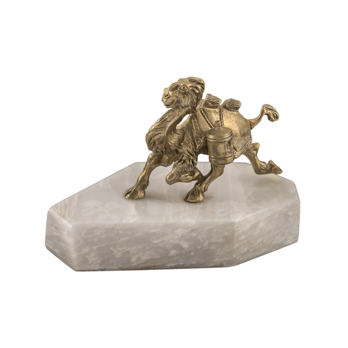 Мастерская «Калежа» создает креативные подарки из латуни, изображающие животных. Верблюд с бочками выполнен с помощью бронзового литья и закреплен на каменной подставке. Чтобы получить необходимый рельеф шерсти, мы применяли гравировку, а часть декоративных элементов полировалась до блеска. Возможно изменение позы животного или добавление других деталей. Наши мастера также работают с эскизами клиентов.