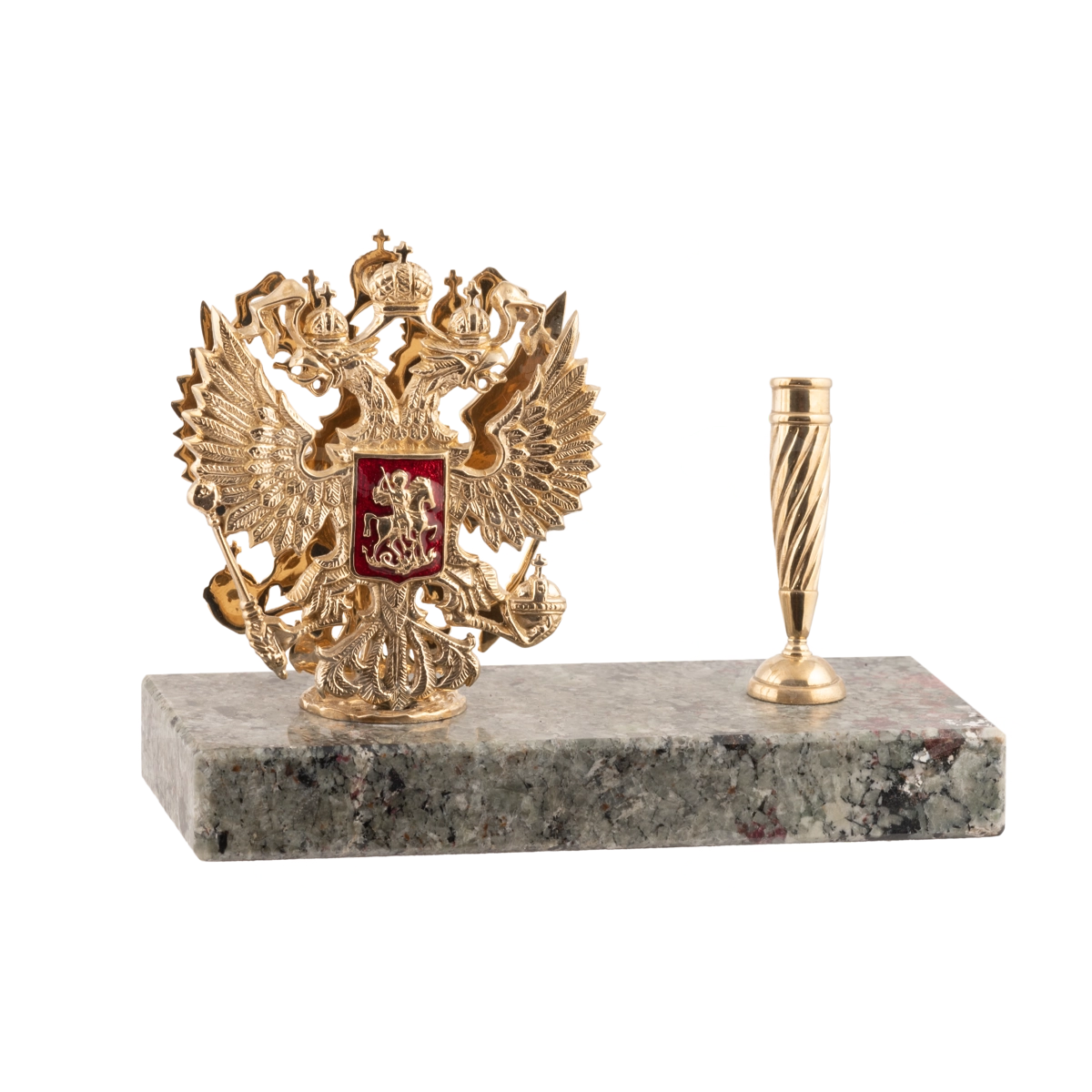Мастерская «Калежа» выполняет эффектные авторские сувениры для органов государственной власти. Визитница с гербом России создана по технологии бронзового литья. Некоторые детали герба РФ с двуглавым орлом покрыты ювелирной эмалью красного цвета. Предусмотрена подставка для ручки. Основание выполнено из камня. Мы изготавливаем подобные аксессуары за три недели.