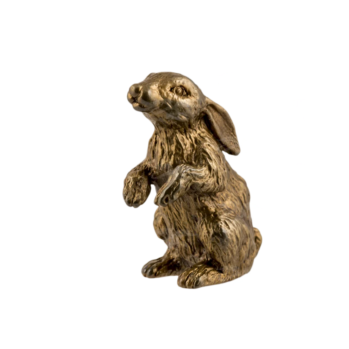 Мастерская «Калежа» изготавливает статуэтки животных из латуни. Примером такой работы может служить зайчик с прижатыми ушками. Фигурка выполнена по технологии бронзового литья. При создании рельефа кожи мастера использовали химическую гравировку. Вы можете выбрать другой образец для оформления или добавить новые детали. На создание подобных сувениров уходит около трех недель.