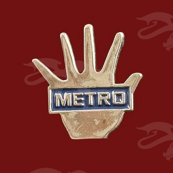 Мастерская «Калежа» изготавливает аксессуары небольшого размера, используя латунь. Значок «МЕТРО» выполнен с применением бронзового литья. В центре композиции – изображение руки, которая держит логотип торговой компании. Он окрашен синей ювелирной эмалью. Срок изготовления подобных знаков составляет до трех недель. Возможно использование другого образа или добавление новых элементов.