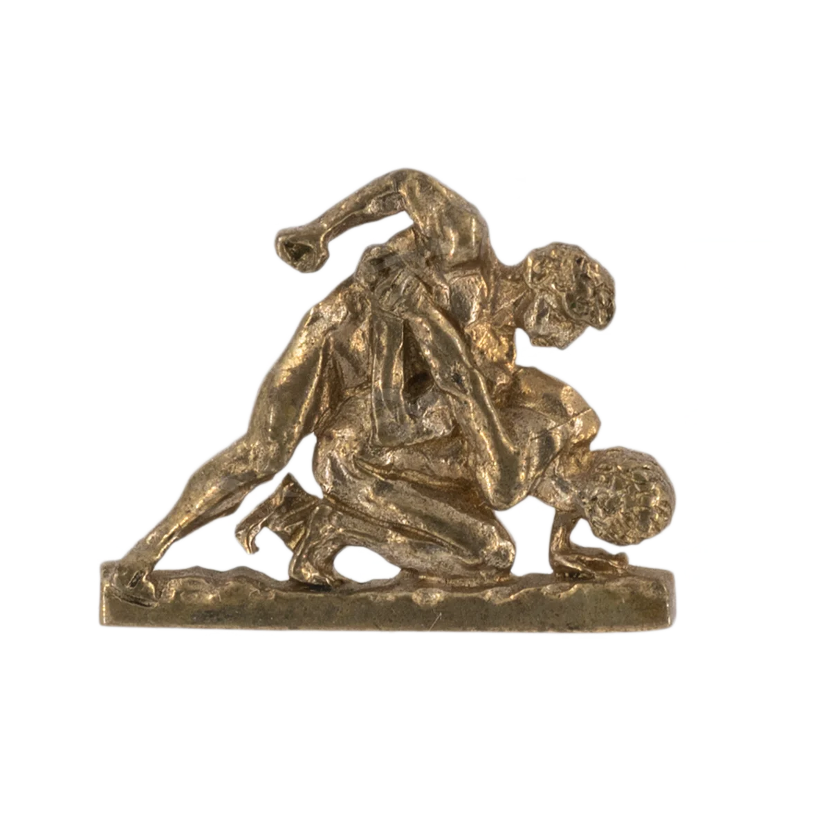 Мастерская «Калежа» изготовила оригинальный значок «Борцы» из латуни. В своей работе специалисты использовали литье. В центре композиции – две фигурки атлетов, сражающихся в греко-римском стиле. Поверхность обработана с помощью технологии золочения. Для создания подобного знака требуются три недели. Мастера могут использовать ваши готовые эскизы.