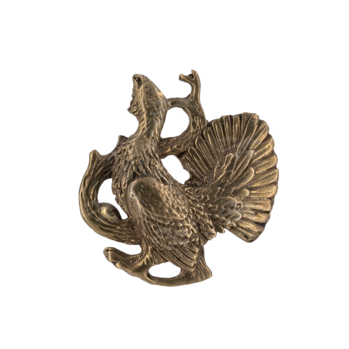 Художественно-производственная мастерская «Калежа» создает миниатюрные аксессуары для охотников. При изготовлении значка «Глухарь» наши специалисты использовали латунь. Для получения рельефного изображения птицы применялось бронзовое литье. Поверхность можно тонировать с помощью чернения, серебрения, золочения и других технологий. Мастера изготавливают сувениры в течение трех недель.