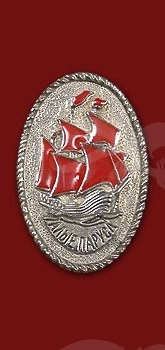 Знак «Алые паруса» выполнен из латуни – с этой целью мы использовали художественное литье. Главный элемент оформления медальона – изображение фрегата из романтической повести Александра Грина. Паруса окрашены ювелирной эмалью в красный цвет. Мастерская «Калежа» изготавливает подобные сувениры за три недели. Мы разрабатываем креативный дизайн для создания нестандартных аксессуаров.