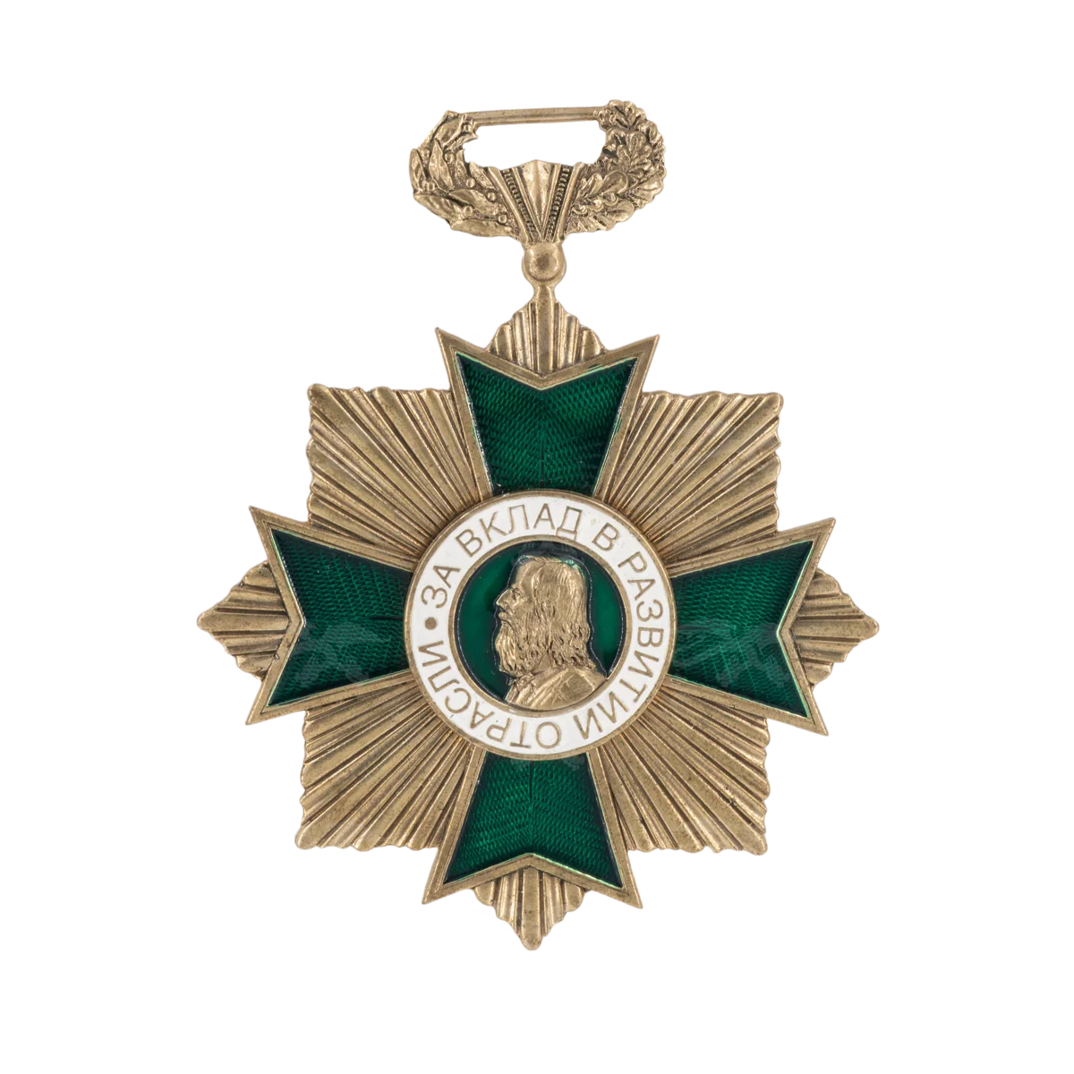 Чтобы заказать креативные аксессуары для вашей компании, обращайтесь в мастерскую «Калежа». Мы создаем нестандартные сувениры из латуни. Знак «За вклад в развитие отрасли» изготовлен по технологии бронзового литья. Он имеет форму ордена. В оформлении можно увидеть детали, окрашенные ювелирной эмалью белого и зеленого цветов. Наши мастера работают над уникальными значками в течение трех недель.