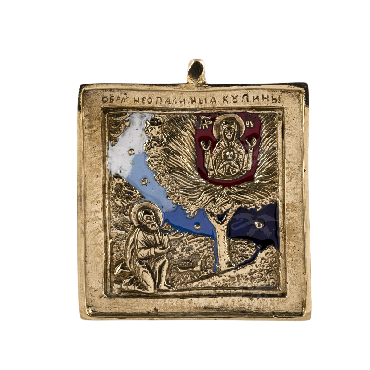 Мастерская «Калежа» создает церковную утварь разного назначения, используя латунь. Икона Неопалимая купина выполнена с помощью бронзового литья. Для получения сложного объемного изображения мы использовали технологии чернения и химической гравировки. Детали окрашены цветной ювелирной эмалью. Подобные образы будут выполнены нашими мастерами всего за три недели. Возможно использование предоставленных эскизов.
