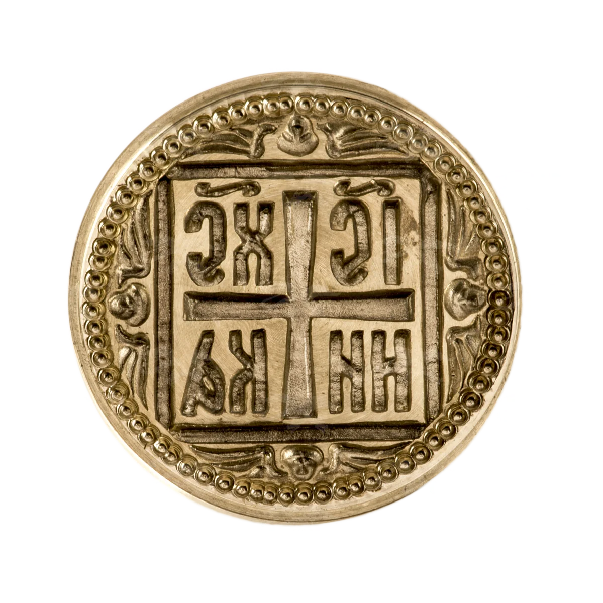 Печать крестовая изготовлена из латуни. Чтобы получить нужную форму, наши специалисты использовали художественное литье. Для создания церковной утвари также применялось чернение. С его помощью детали рисунка приобрели благородный глубокий оттенок. Ручка выполнена из натурального дерева. Работа над подобным проектом в мастерской «Калежа» занимает не более трех недель. По заказу мы изменяем элементы оформления.